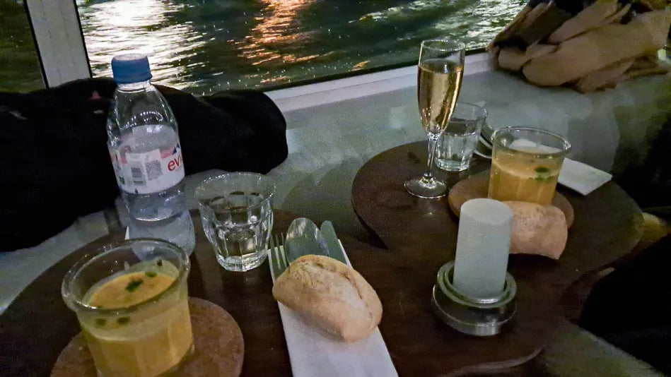 - 为 59€,您可以享受一个 三道菜的餐点 包括汤、主菜和甜点,以及一瓶水。