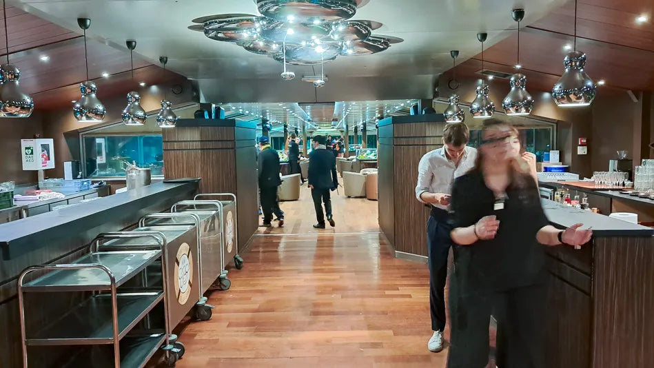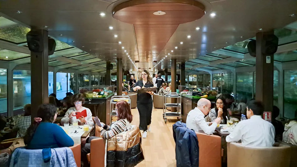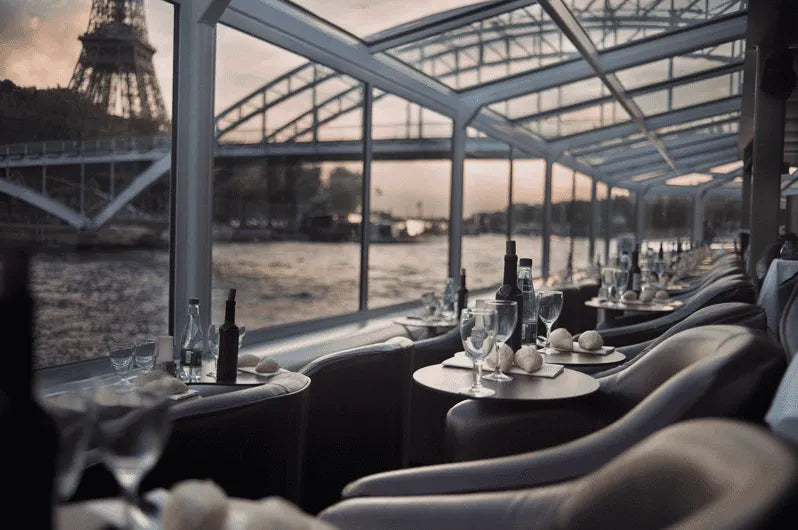 - 在这艘船上,有一对舒适的 带可折叠迷你桌的桶椅 附上。这些 椅子面向窗户, 提供全景视图。适合四人团体, 常规桌子 标准方向可在中心和前面获得。