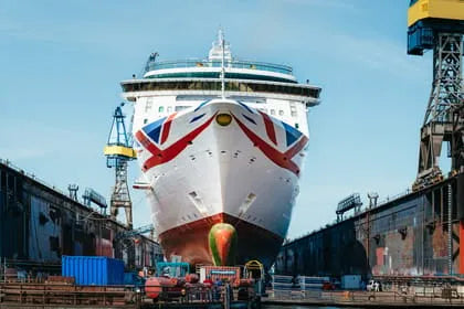 Container Ships and St. Pauli’s Pier: Pass container ships and St. Pauli’s Pier.