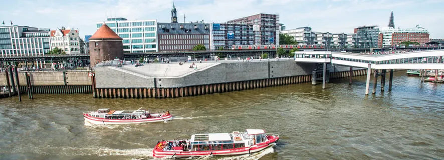 Starting Point: Cross "Überseebrücke" bridge to board a traditional "Barkasse."